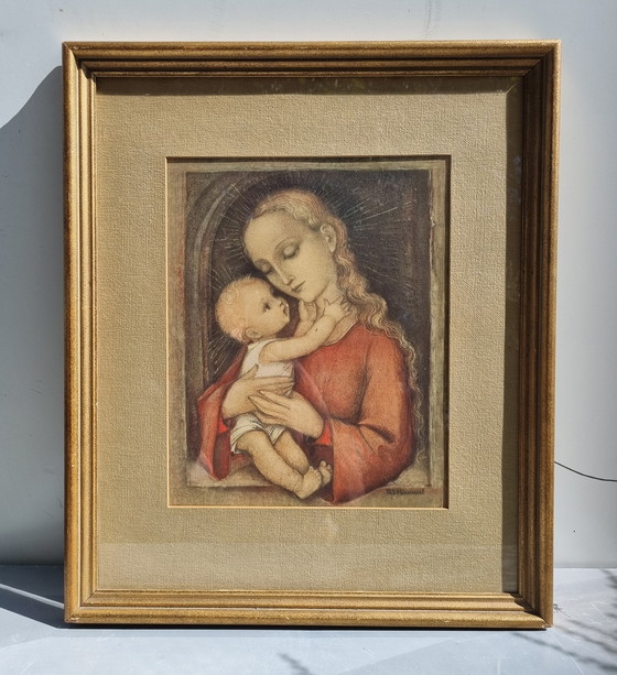 Wunderschön gerahmter Kunstdruck aus dem Jahr 1950 im Jugendstil, der Maria mit dem Jesuskind darstellt.