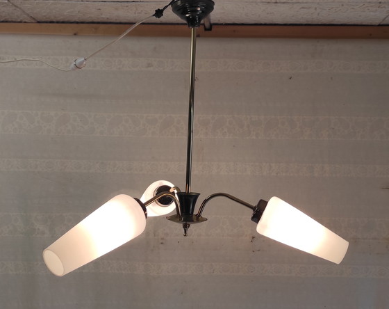 Dreiflammiger Messing-Kronleuchter mit Opalglasschirmen – 1950er/60er Jahre
