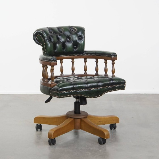 Dieser zeitlose und klassische Chesterfield-Bürostuhl aus dunkelgrünem Rindsleder und Holz passt perfekt zu nahezu jedem Einrichtungsstil, auch zu Büroumgebungen. Dank der Rollen lässt er sich leicht bewegen, und der Stuhl besticht durch sein edles Finish mit dekorativen Nieten. Er ist höhenverstellbar, schwenkbar und neigbar und weist normale Gebrauchsspuren auf. Strukturell ist er in gutem Zustand und sofort einsatzbereit. Bei richtiger Pflege und Wartung wird er Ihnen viele Jahre lang Freude bereiten!