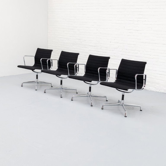 Der Eames EA 108 Drehstuhl ist in schwarzem Hopsak-Leder gehalten und verfügt über ein poliertes Aluminium-/Chrom-Gestell und Armlehnen. Dieses Modell wurde 1958 von Charles & Ray Eames als Teil der Aluminium Group entworfen. Der Stuhl wurde von Vitra, dem offiziellen Lizenznehmer, produziert, und dieses Exemplar stammt aus den 1990er-Jahren. Der Stuhl ist in gutem Vintage-Zustand, lässt sich leicht drehen und bietet die für die EA-Serie charakteristische bequeme Sitzposition und zeitlose Optik. Hinweis: Vier Stück verfügbar, Preis pro Stück.