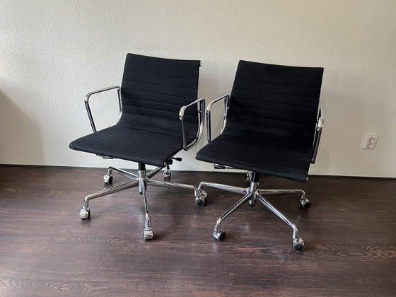 Werten Sie Ihren Arbeitsplatz mit der zeitlosen Eleganz des Eames EA108 Stuhlsets auf. Diese ikonischen Stühle, entworfen von Charles und Ray Eames, sind ein Zeugnis des Mid-Century-Modern-Designs und vereinen Stil und Komfort. Der elegante schwarze Textilbezug harmoniert perfekt mit dem polierten Metallgestell und schafft einen anspruchsvollen Look, der sich nahtlos in jedes Büroambiente einfügt.