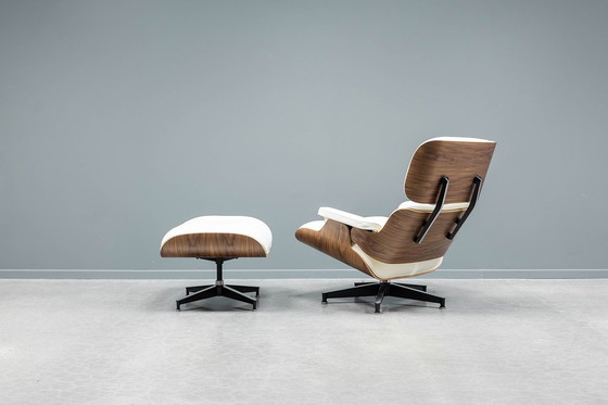 Ein hoher Loungesessel in einer schönen Weiß/Walnuss-Kombination. -Designer: Charles & Ray Eames -Hersteller: Herman Miller -Materialien: weißes Leder/Walnussholz -Zustand: neuwertiger Zustand!