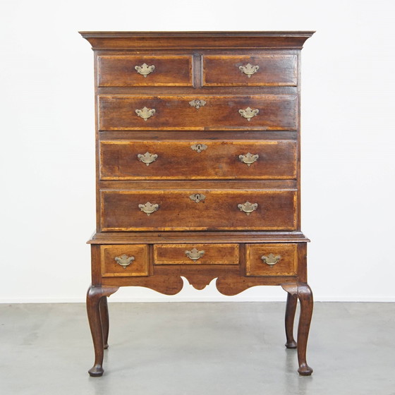 Diese schöne englische Eichenkommode, auch Standtruhe oder Highboy genannt, passt aufgrund ihres zeitlosen Aussehens in fast jedes Interieur und ist eine perfekte Anschaffung für Liebhaber von reinen englischen Antiquitäten. Sie sieht nicht nur anmutig aus, sondern ist auch äußerst praktisch, da sie 8 Schubladen hat, in denen Sie Ihre Sachen unterbringen können. Dieser fantastische Schrank aus dem frühen 18. Jahrhundert ist an den Schubladen furniert und sein ultimativer luxuriöser Charme macht ihn zu einem Blickfang in jedem Einrichtungsstil. Durch den jahrelangen, verantwortungsvollen Gebrauch weist er normale Gebrauchsspuren auf. Strukturell ist er in einem guten und natürlich sofort nutzbaren Zustand. Bei sachgemäßer Nutzung und Pflege werden Sie viele Jahre Freude an diesem tollen Schrank haben. Er besteht aus zwei Teilen, einem unten und einem oben, wodurch er leicht zu transportieren ist. Wo soll er aufgestellt werden?