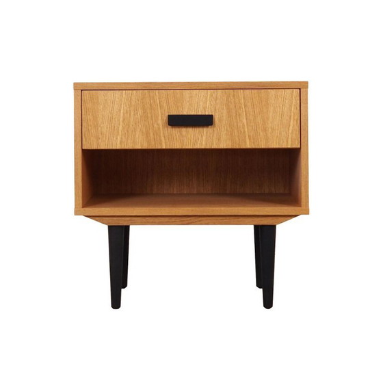 Das Gestell ist mit Eichenfurnier versehen. Die Beine sind aus massivem, schwarz gebeiztem Holz. Die Oberfläche wurde neu lackiert. Im Inneren befinden sich eine praktische Schublade und ein geräumiges Fach.