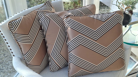 Set mit 3 neuen, hochwertigen Dekokissen. Die Kissen sind in Goldbronze gehalten und mit einem geometrischen Muster versehen. Sie sind quadratisch und passen perfekt in jedes Interieur.