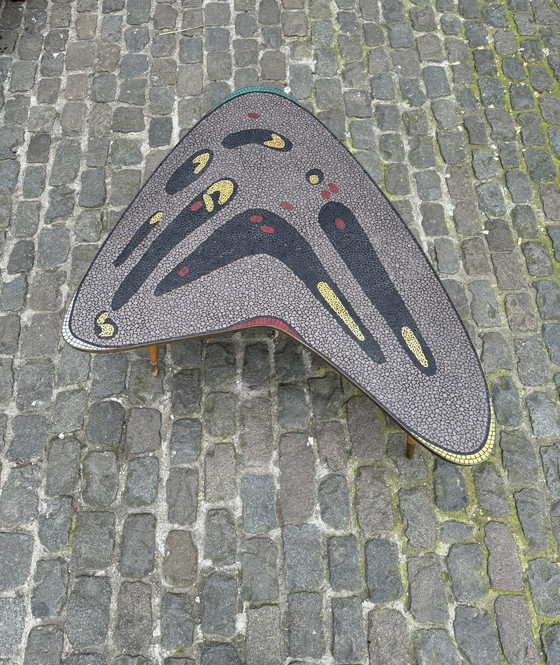 Bumerang-Couchtisch von Berthold Müller, bestehend aus einer Tischplatte aus Mosaik und Gold mit einem Holzgestell mit Messingverzierungen. Herkunft des Tisches: Deutschland. Berthold Müller (1893-1981), ist ein deutscher Designer, mehrheitlich in der Kategorie Möbel zu finden. Zögern Sie nicht, uns zu kontaktieren, um weitere Informationen zu erhalten.