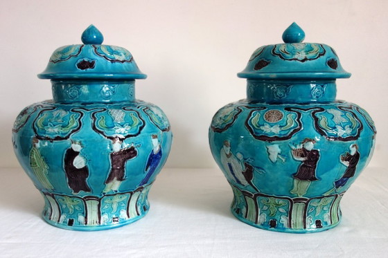 Ein Paar gedeckter Tonkrüge mit mehrfarbiger Cloisonné-Glasur, sogenannte "Fahua"-Krüge, mit schmaler Basis, eiförmigem Bauch und zylindrischem Hals, mit Dekor der acht Unsterblichen um Shoulao und seinen Hirsch, die Basis mit Lotusblumen und die Schulter mit den acht buddhistischen Emblemen verziert. China, 20. Jahrhundert.