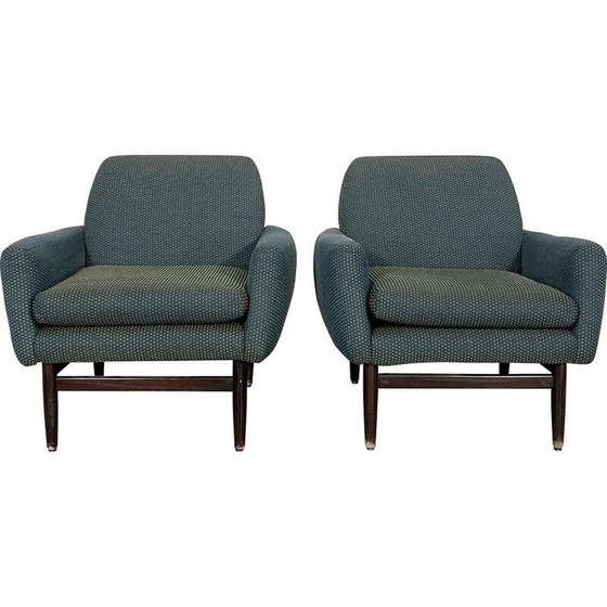 Sehr guter Vintage-Zustand für dieses Set aus zwei italienischen Sesseln, die in den 60er Jahren in Italien hergestellt wurden und aus Stoff und Holz mit Metalldetails an den Füßen bestehen