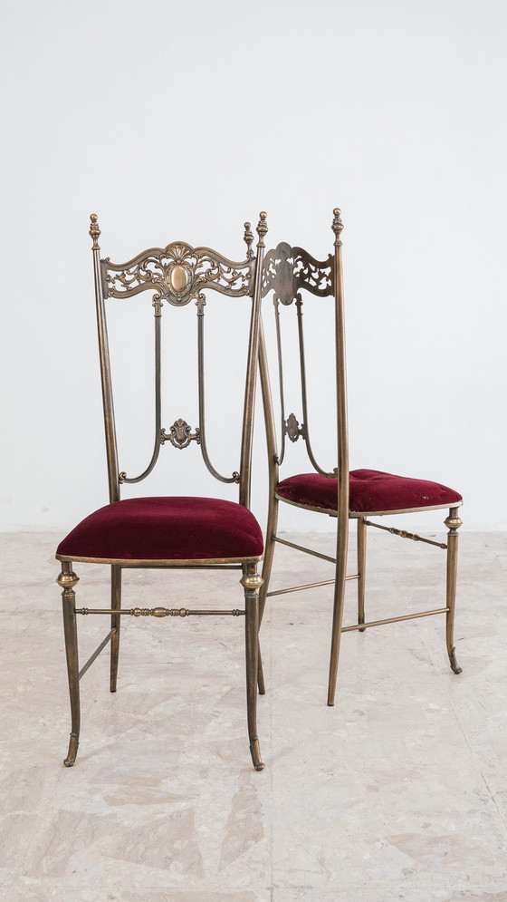 Die Stühle zeichnen sich durch geschwungene und elegante Messinggestelle aus, typisch für die Ästhetik dieser Zeit, und einen mit rotem Samt bezogenen Sitz, der ihnen eine warme und zugleich raffinierte Eleganz verleiht.