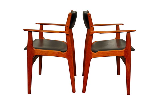 Die aus massivem Teakholz gefertigten Stühle verkörpern die zeitlose Eleganz und hervorragende Handwerkskunst, für die das dänische Mid-Century-Design bekannt ist. Die warme, glänzende Teakholzmaserung bringt die natürliche Schönheit des Holzes zur Geltung, während die schlanken, skulpturalen Linien der Stühle die Hingabe der Ära an Form und Funktion widerspiegeln.