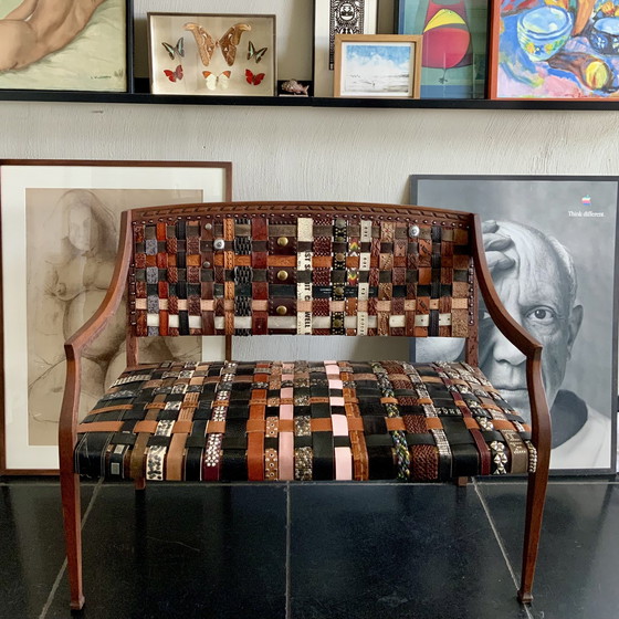 Angewandtes nachhaltiges Design dieses Sofa und ein Blickfang in jedem Interieur. Der Polstermöbelhersteller hat einem antiken Gestell mit einem handgefertigten neuen Federsitz neues Leben eingehaucht, kombiniert mit Vintage-Design durch die Wiederverwendung von Lederriemen in einem geflochtenen Muster.