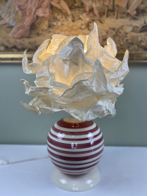 Einzigartig, märchenhaft, lassen Sie Ihrer Fantasie freien Lauf: ein Bonbon, ein Eis, eine Blume, eine Sehnsucht, Poesie... diese Lampe wird Sie nicht gleichgültig lassen. Der kugelförmige Lampenfuß aus Keramik mit rosaroten, wirbelnden Streifen wird durch einen Lampenschirm aus dickem, zerknittertem Papier veredelt, den Sie nach Belieben gestalten können. Gesamthöhe 55cm. Durchmesser des Fußes 22cm. Der Lampenschirm wird für den Versand abgeschraubt. Glühbirne wird mitgeliefert.