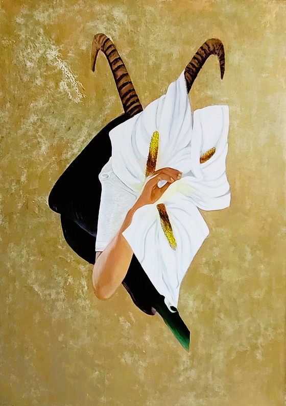 Ein fesselndes handgemaltes Kunstwerk mit satten Olivtönen und surrealistischen Elementen. Dieses Kunstwerk verbindet natürliche Symbolik mit einer faszinierenden Komposition und ist ein beeindruckender Blickfang für jeden Raum.