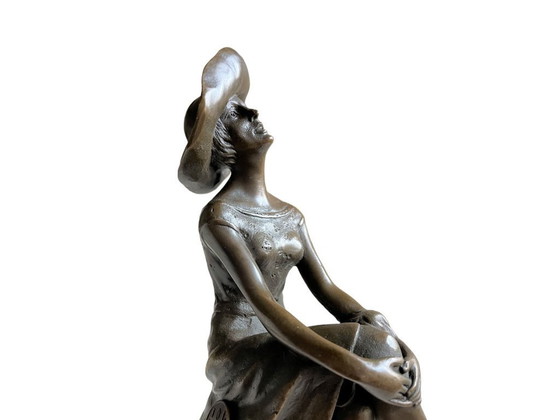 Elegante Bronzeskulptur - Sitzende Dame mit Hut auf Barhocker (28 cm)