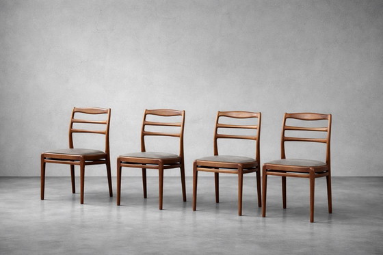 Dieses moderne Set aus vier eleganten Stühlen wurde in den 1960er Jahren in Dänemark gefertigt. Die Stuhlgestelle bestehen aus massivem Teakholz, das für seine außergewöhnlichen Eigenschaften geschätzt wird. Das Teakholz besticht durch einen warmen, tiefen Farbton und eine markante Maserung, die den Möbeln einen natürlichen Charme verleiht. Die charakteristische Rückenlehne mit ihren drei dezent geschwungenen Streben ist nicht nur optisch ansprechend, sondern auch ergonomisch und bietet bequemen Halt. Alle Kanten sind sanft abgerundet, was der Struktur Leichtigkeit verleiht und die hohe Handwerkskunst unterstreicht. Jeder Sitz wurde mit einem hochwertigen Stoff in einem eleganten Grauton neu bezogen, der perfekt mit dem Holz harmoniert und den Stühlen einen modernen Charakter verleiht. Diese Stühle sind nicht nur bequem, sondern auch ein authentisches Beispiel skandinavischen Designs. Dank ihrer vielseitigen Farben und ihrer leichten, aber dennoch robusten Konstruktion passen die Stühle sowohl zu klassischen als auch zu modernen Einrichtungen. Sie sind mehr als nur Möbelstücke – sie sind ein Zeugnis von Handwerkskunst und gutem Design, das die Zeit überdauert hat.