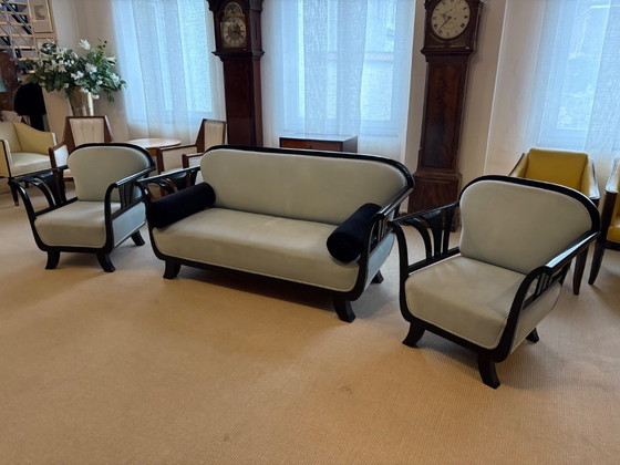 Elegante Wohnzimmergarnitur im Art-Deco-Stil – Sofa und zwei Sessel – dunkel lackiertes Holz – ca. 1925–1935