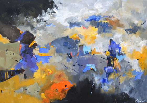 Dieses beeindruckende abstrakte Werk mischt kühn leuchtende Blau-, Gelb- und Orangetöne mit dunklen Schwarz- und Grautönen. Die energischen Pinselstriche erzeugen eine überraschende Dynamik, die eine Szene von harmonischem Chaos heraufbeschwört. Die kühnen Kontraste zwischen warmen und kühlen Farben erwecken eine fesselnde Tiefe zum Leben, die an eine Art Traumlandschaft denken lässt. Die verschwommenen, geschichteten Formen fügen eine geheimnisvolle Dimension hinzu, die zur persönlichen Interpretation einlädt. Die kunstvoll ungeordnete Komposition zeugt von der außergewöhnlichen Beherrschung der abstrakten Kunst durch die Künstlerin, die einen in der Zeit eingefrorenen, symbolischen und für die Fantasie offenen Moment festhält. Das Werk besticht durch seine Ausgewogenheit zwischen Spontaneität und Absicht und offenbart eine künstlerische Vision, die sowohl die Komplexität als auch die Schönheit des Unbekannten zelebriert.