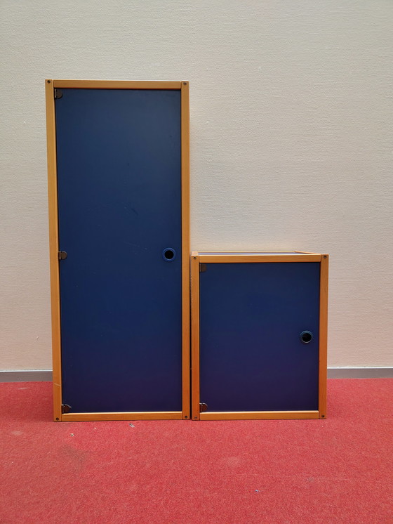 Zwei einzigartige Schränke von Elmar Flötotto aus den 1970er-Jahren in einem markanten Blau mit Holzkanten. Die Möbelstücke weisen altersbedingte Gebrauchsspuren auf (siehe Fotos), die ihren Vintage-Charakter unterstreichen. Ein perfektes Accessoire für Liebhaber von Retro-Design und eine stilvolle Ergänzung für jedes Interieur.