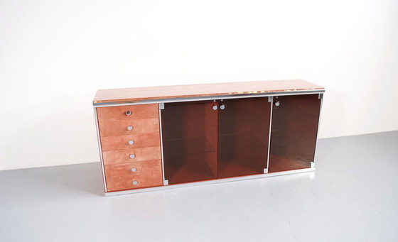 Sideboard von Guido Faleschini, Mariani Italia éditeur, 1970er Jahre. 6 Schubladen und 3 Stauräume zum Öffnen und Schließen mit magnetischen Glastüren und Glasböden. Platte aus geädertem braun/orangem Marmor. Auf der Vorderseite mit leicht verblichenem rotem Wildleder bezogen. Oberfläche aus verchromtem Stahl. Höhe 84 cm Tiefe 46 cm Länge 200 cm