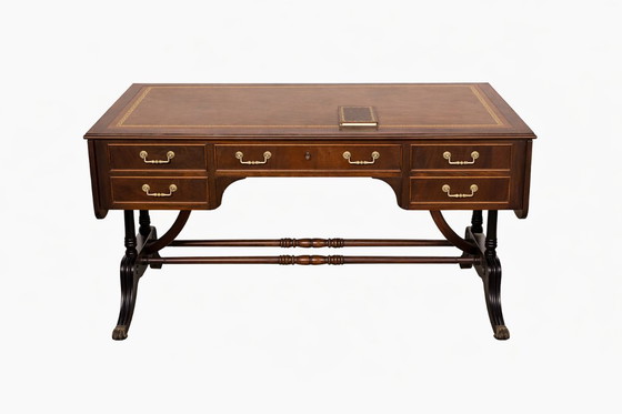 Entdecken Sie die zeitlose Eleganz dieses englischen Mahagoni-Schreibtisches, der Ihrem Arbeitsplatz einen Hauch von Raffinesse verleiht. Der doppelseitige Schreibtisch mit flacher Tischplatte ist ausziehbar und bietet so mehr Flexibilität und Funktionalität für Ihre beruflichen Bedürfnisse.