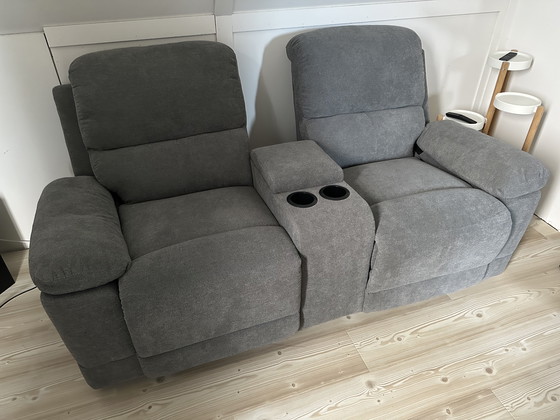 Verstellbares Sofa mit Staufach und Getränkehaltern.