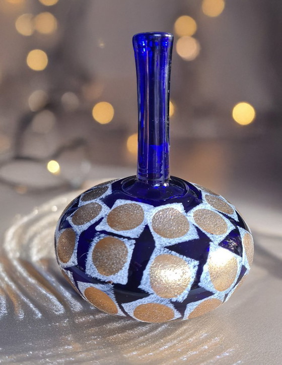 Merkmale: Die Vase hat einen gewölbten Boden, einen schmalen Hals und ein markantes Muster aus goldfarbenen Punkten, die von weißer Glasur auf dem blauen Glas umgeben sind.