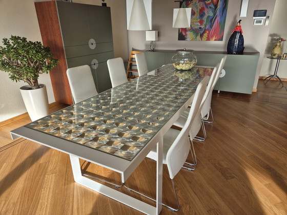 Erleben Sie die raffinierte Eleganz des Esstisches Lens und der sechs passenden Stühle von B&B Italia. Dieses Set vereint modernes Design mit hochwertigen Materialien und ist eine wunderschöne Bereicherung für jedes Esszimmer. Die Tischplatte aus Glas erzeugt einen einzigartigen visuellen Effekt und verleiht Ihrem Interieur einen Hauch von Raffinesse. Die Stühle sind mit luxuriösem Leder bezogen und bieten Komfort und Stil – ideal für lange Abendessen mit Freunden und Familie. Das schlanke Metallgestell von Tisch und Stühlen sorgt für einen modernen Look, der sich mühelos in verschiedene Einrichtungsstile einfügt. Verleihen Sie Ihrem Essbereich mit diesem wunderschönen Set von B&B Italia einen Hauch italienischer Klasse. Kontaktieren Sie uns noch heute für weitere Informationen oder um einen Besichtigungstermin zu vereinbaren.