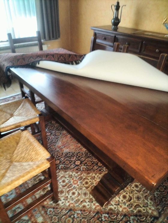 Dieses klassische Esszimmer-Set, bestehend aus einem robusten Holztisch und passenden Stühlen, strahlt zeitlose Eleganz aus. Das warme Braun des Holzes und die geflochtenen Stühle schaffen eine einladende Atmosphäre in jedem Esszimmer.
