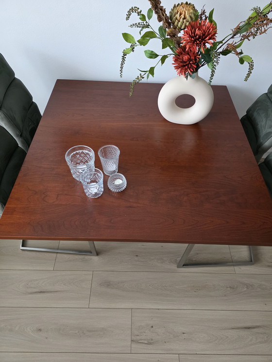 Wunderschöner Esstisch aus massivem Kirschholz mit quadratischer Tischplatte (120 x 120 cm). Dieser Tisch ist ein echter Blickfang in jedem Esszimmer. Das massive Kirschholz verleiht ihm eine warme und luxuriöse Ausstrahlung. Der Tisch ist in gutem Zustand und sofort einsatzbereit. Perfekt für gemütliche Abendessen mit Familie und Freunden.