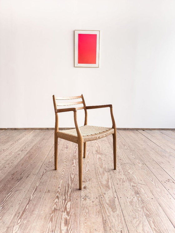 Außergewöhnlich seltener Sessel, entworfen von Niels O. Møller und hergestellt von J.L. Møllers Møbelfabrik, Dänemark. Modell 62 gilt als einer der raffiniertesten und begehrtesten Entwürfe in Møllers Werk und ist bei Sammlern dänischer Mid-Century-Möbel äußerst gefragt. Gefertigt aus massiver Eiche und neu bezogen mit einem handgewebten Sitz aus original dänischer Papierkordel. Der Sessel besticht durch seine skulpturale Handwerkskunst, insbesondere durch die fein geformten Rückenlehnenstützen und die elegant geschwungenen, sich verjüngenden Armlehnen. Ihre sanfte Formgebung bietet hervorragenden Sitzkomfort und eine angenehme Haptik.