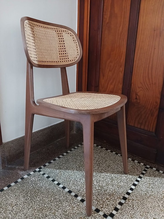 Stilvolle Esszimmerstühle mit Holzgestell und Sitz-/Rückenlehne aus Rattan.