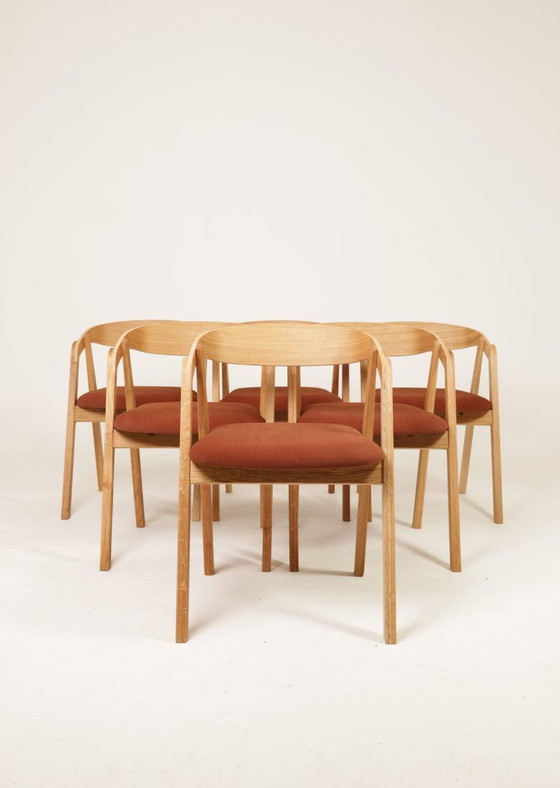 Das Eichenholz wurde sorgfältig mit einem natürlichen Öl behandelt, wodurch die volle Maserung zur Geltung kommt und ein warmer, authentischer Farbton entsteht. Die Sitze sind mit einem dezent dunklen, matten, kupferfarbenen Samt bezogen, der wunderbar mit dem hellen Holz harmoniert. Ein Set, das gleichermaßen zurückhaltend und raffiniert ist und sich ideal für einen modernen Esstisch oder ein Interieur im Vintage-Stil eignet.