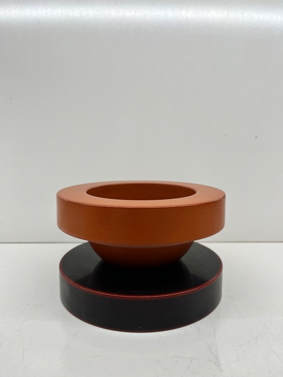 Gefertigt aus Phenolharz mit Polyurethanlackierung, besticht sie durch eine Kombination aus Geranienrot und Braun, einer charakteristischen Farbpalette, die häufig in Sottsass’ Werk zu finden ist. Die Schale ist am Boden mit den Namen des Designers und des Herstellers gekennzeichnet.