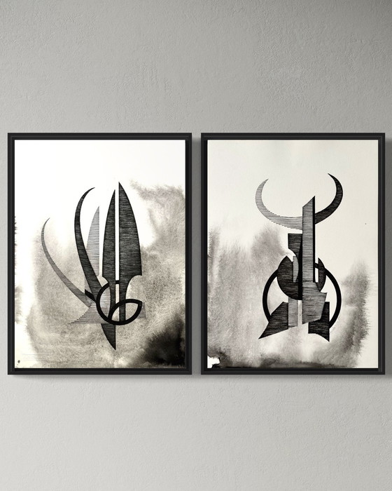 Ein Satz von zwei originalen Tuschezeichnungen auf Papier im typischen Stil des Künstlers. Fließende Formen, dynamische Linien und reiche Farbkontraste zeugen von seiner meisterhaften Beherrschung des Mediums. Die von den belgischen Surrealisten beeinflussten Kompositionen evozieren eine traumhafte Spannung zwischen Präzision und Spontaneität. Diese kühnen und doch eleganten Werke sind eine Bereicherung für jedes Interieur - ob klassisch, modern oder minimalistisch.