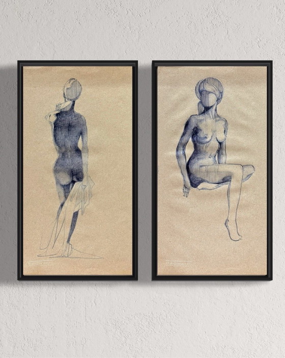 Zwei zusammenhängende Tusche- und Graphitzeichnungen auf Kunstdruckpapier von Eechaut, die jeweils das Wesen der menschlichen Figur mit Eleganz und Zurückhaltung einfangen. Die gesichtslosen weiblichen Formen sind in dem erkennbaren minimalistischen Stil des Künstlers wiedergegeben, in dem zarte Linien und subtile Schattierungen sowohl Bewegung als auch Emotion vermitteln.
