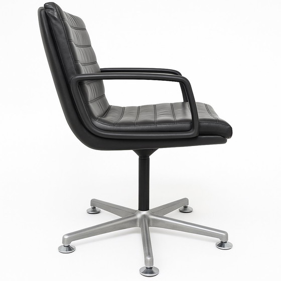 Original Eurosit-Stuhl aus den 1970er oder 1980er Jahren. Sitz und Rückenlehne sind mit schwarzem Leder gepolstert und mit horizontalen Linien abgesteppt. Das Gestell ist aus schwarzem Metall gefertigt. Er hat ein Fünfstern-Aluminiumgestell mit festen Gleitern (keine Räder) und ist schwenkbar. Die ungefähre Sitzhöhe beträgt 48 cm. Der Gesamtzustand ist gut, mit einigen altersbedingten Gebrauchsspuren.