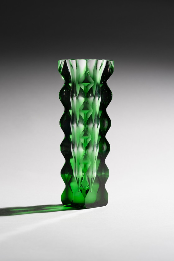 Beleuchtet verwandelt sich die Vase in eine kinetische optische Skulptur: Reflexionen vervielfachen sich, innere Hohlräume leuchten, und der leuchtend grüne Kern verändert seine Tiefe und Intensität. Sie zählt zu den architektonisch faszinierendsten Entwürfen böhmischer Glaskunst des 20. Jahrhunderts.