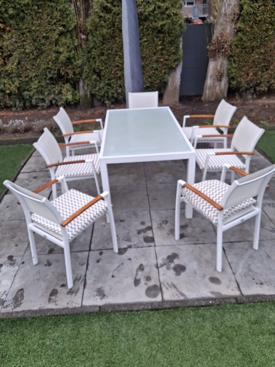 Modernes und stilvolles weißes Aluminium-Gartenmöbel-Set von Farmers Outdoor, bestehend aus einem Tisch mit weißer Milchglasplatte und 7 bequemen Stühlen. Das Set ist aus hochwertigem, pulverbeschichtetem Aluminium gefertigt und in einwandfreiem Zustand.