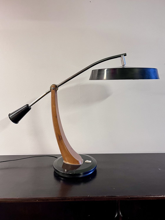 Tischlampe Fase, Spanien, 1960. Modell Präsident Pendulo. Lampe mit einem Gegengewicht. Kugelgelenk an der Basis des Lampenschirms. Schalter. Arme aus Teakholz, Lampenschirm aus schwarz lackiertem Metall, Sockel aus Stahl.