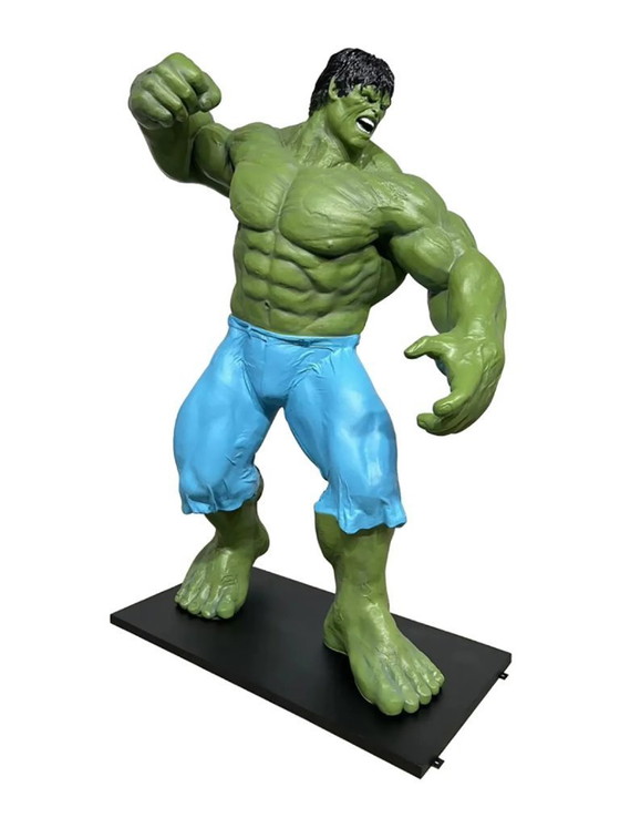Entdecken Sie die beeindruckende Präsenz dieser modernen Fiberglas-Skulptur – eine Hommage an einen legendären Helden der Comicwelt. Mit ihrem kräftigen Grün und der dynamischen Pose verleiht dieses Kunstwerk jedem Raum Kraft und Energie. Perfekt für Liebhaber von Comicfiguren und moderner Kunst.