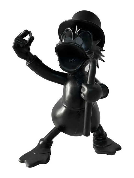 Entdecken Sie den Charme dieser einzigartigen Fiberglas-Skulptur – ein Meisterwerk, das die ikonische Comic-Ente zum Leben erweckt. Mit ihrer glänzend schwarzen Oberfläche und dem detailreichen Design ist diese Statue ein beeindruckendes Kunstwerk, das jeden Raum bereichert.