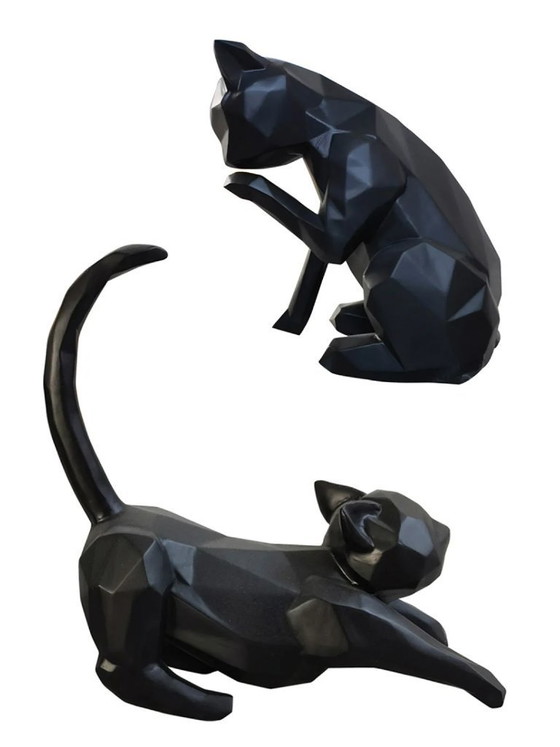 Dieses Set aus zwei modernen Katzenskulpturen aus hochwertigem Fiberglas ist eine stilvolle Bereicherung für jedes Interieur. Die klaren, geometrischen Formen und die tiefschwarze Farbe verleihen den Skulpturen einen modernen Look, der elegant und zugleich verspielt wirkt.