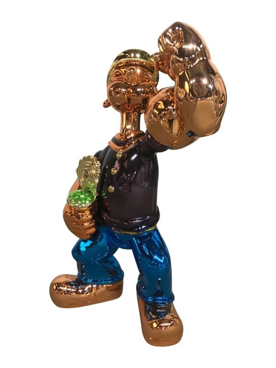 Entdecken Sie den Charme dieser einzigartigen Fiberglas-Skulptur – ein Meisterwerk, das die ikonische Comicfigur des Matrosen in einer lebendigen Farbpalette zum Leben erweckt. Dieses Kunstwerk ist die perfekte Ergänzung für jeden Raum, der einen Hauch von Verspieltheit und künstlerischem Flair vertragen könnte.