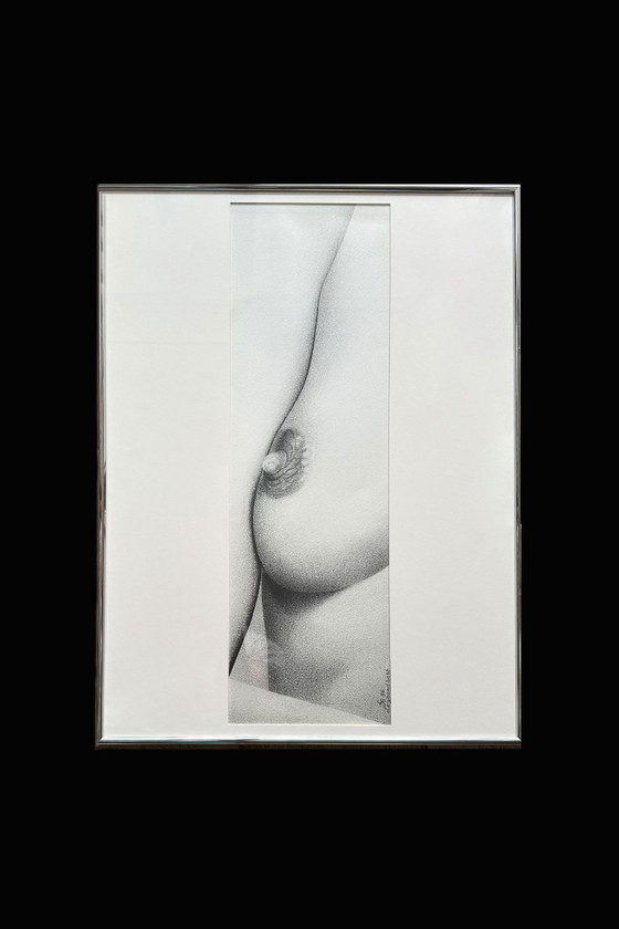 Hinweis: Die dunkleren Bereiche oder „Flecken“ auf den Fotos sind lediglich Lichtreflexe auf dem Glas, das das Kunstwerk schützt. Bleistiftzeichnung auf schwerem Papier. Ich habe die pointillistische Bleistifttechnik selten in solch perfekter Ausführung und mit solch einer unglaublich realistischen Darstellung gesehen. Die Hautstruktur ist absolut atemberaubend. Solche Arbeiten benötigen Wochen zur Fertigstellung. Signiert und datiert Degrandsart. Perfekter Zustand mit nur wenigen, geringfügigen Gebrauchsspuren. Rahmenmaße: 66 x 50 cm. Gesamtmaße des Kunstwerks: 62 x 20 cm. Glänzender Metallrahmen mit cremefarbenem Passepartout. Die dunkleren Bereiche sind lediglich Lichtreflexe auf dem Glas, das das Kunstwerk schützt. Foto im Freien aufgenommen. Ein weiteres Werk desselben Künstlers in ähnlichem Stil (siehe die letzten Fotos in der Galerie) finden Sie in meinen anderen Angeboten.