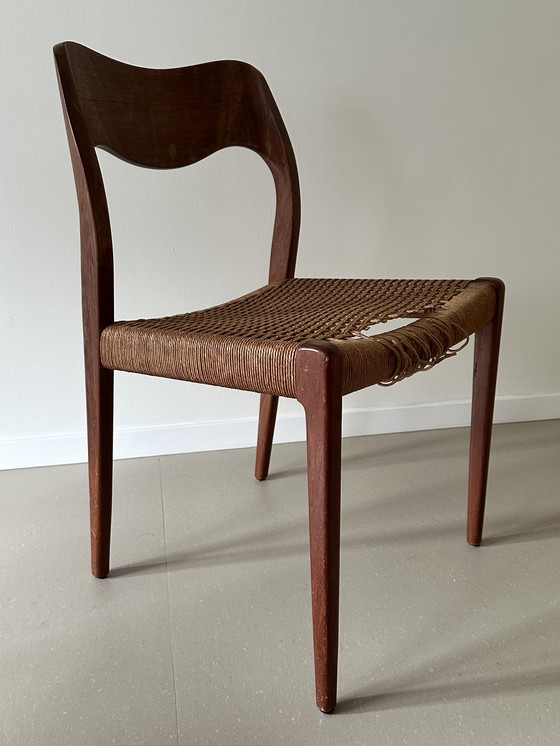 Originaler Stuhl, Modell 71, vom dänischen Mid-Century-Designer Niels Otto Møller. Er benötigt einen neuen Sitz aus Papierkordel, was den Preis erklärt.