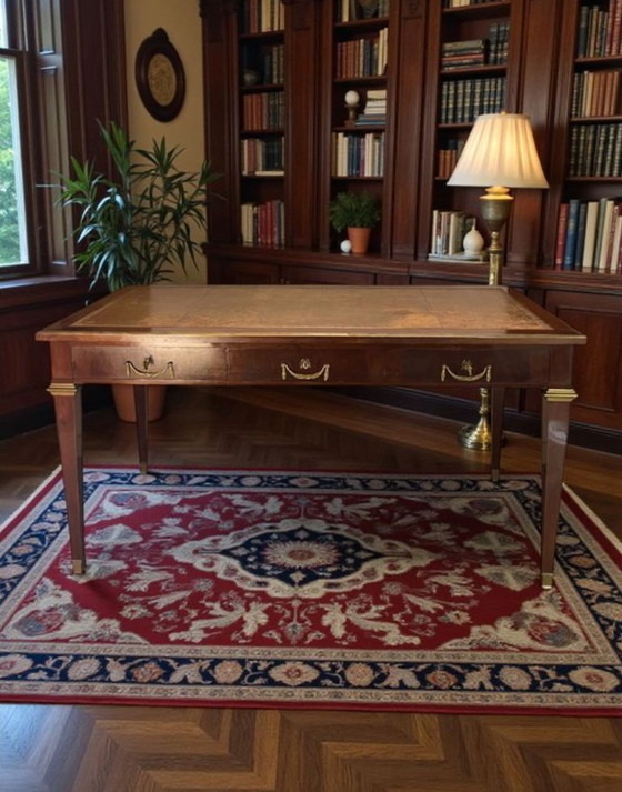 Flacher Schreibtisch aus Mahagoni im Stil Louis XVI., Lederplatte und Bronzeverzierungen