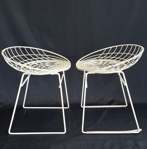 Sie sind bekannt für ihr minimalistisches Design aus weiß lackiertem Metalldraht und werden auch als „Flamingo“-Hocker bezeichnet.