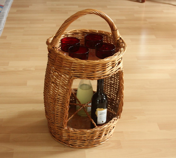 Handgeflochtener Flaschenkorb aus Weide und Holz. Vintage Flaschenträger für Wasserflaschen, Wein Saft etc. Sehr schön als Korb für die Flaschenaufbewahrung und als Beistelltisch. Oben gibt es eine Ablagefläche für Gläser, Teekanne, Lektüre. Der Korb ist in gutem Vintage Zustand mit leichten Nutzungsspuren - siehe Fotos. Handarbeit aus den 1970ern.