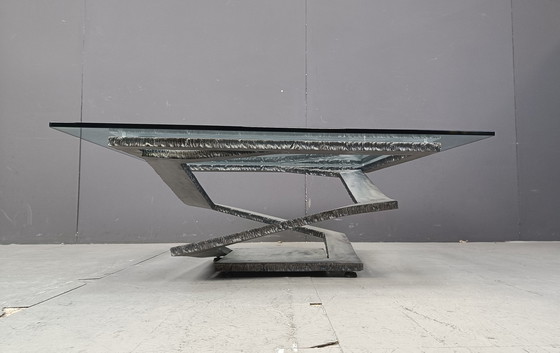 Skulpturaler Couchtisch "Fleur De Fer" aus gebogenem Stahl von Maurice Barilone, hergestellt und verkauft von Roche Bobois. Das zeitlose Design und die Verwendung von rauem und schwerem Stahl machen dieses Stück zu etwas Besonderem. Mit einer klaren Glasplatte versehen, können Sie die Skulptur aus jedem Blickwinkel bewundern. Graviert mit 'Roche bobois' Sehr guter Zustand 1980er Jahre - Frankreich/ Italien Höhe: 40cm Breite x Tiefe: 105cm Ref.: 25021711