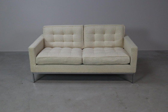 Ein originales Zweisitzer-Sofa von Florence Knoll, entworfen 1954 und in den 1970er Jahren von Knoll International hergestellt. Dieses ikonische Sofa kombiniert klare geometrische Linien mit einem minimalistischen und modernistischen Design. Das Sofa hat einen schlanken Metallrahmen und verfügt über die charakteristischen getufteten Kissen, die mit dem originalen, hochwertigen, grob gewebten Stoff in einem neutralen, zeitlosen Creme-/Weißton gepolstert sind. Dieses zeitlose Designstück passt perfekt in ein modernes, Mid-Century- oder Bauhaus-Interieur. TxHxL: 81x78x160 cm Sitzhöhe: 44 cm Guter Vintage-Zustand.